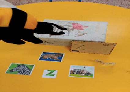 Cuando empezamos un sonido nuevo, cojo la caja mágica de sonidos («The Magic Sound Box) y, con gran misterio, les enseño el sobre correspondiente al sonido que vamos a trabajar. Para la Z, empezamos siempre con una historia, en este caso, mi amiga Zoe ha ido al zoo y ha visto cebras, hasta que el zumbido de una abeja la llevó hasta unas flores preciosas… (cualquier historia en la e podamos utilizar diversas palabras que lleven el sonido Z):