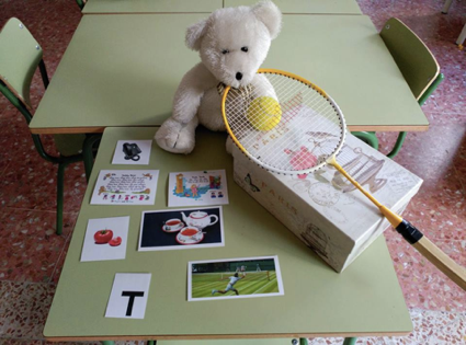 Para presentar este sonido, podemos traer una raqueta de tenis, y botar la pelota de un lado a otro mientras movemos la cabeza, como si siguiéramos un partido de tenis en el que Teddy Bear hace de árbitro; a Teddy le llaman después por teléfono para ir a tomar el té…